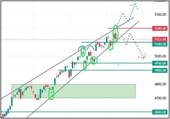 Nach oben wäre bei einem Ausbruch inkl. Übertreibung, ein anstieg in den Bereich 5.300 – 5.350$ möglich, während das Ziel abwärts zuerst die 5.000$ und als momentaner Worst Case, der Bereich zwischen 4.900 – 4.950$, möglich wären. Nach dem langen Kerzendocht am Freitag, scheint der Kurs eher nach unten zu tendieren, was aber bei solchen Psycho-Börsen, nicht als so gegeben angesehen werden kann. Es sind einfach zu viele Emotionen im Spiel.