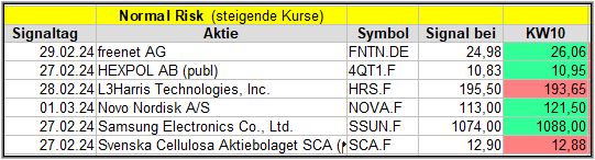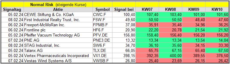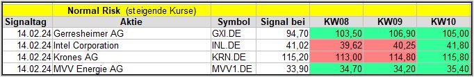 Nun kommen wir zum Update der vorigen Screener-Ergebnisse aus der KW06, KW07, KW08 und KW09, bezogen auf die Schlusskurse in KW10/24. KW05/24 fällt in dieser Woche weg.