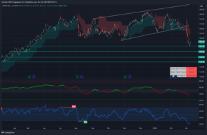 Chartansicht, mit klar erkennbarem, fallenden Trend, denn die EMA´s rauschen alle nach unten. Die meisten, selbst einfachen Warnsignale wurden von der Mehrheit überhört (Gier oder der Glaube es kann nur nach oben gehen?), bis es krachte.