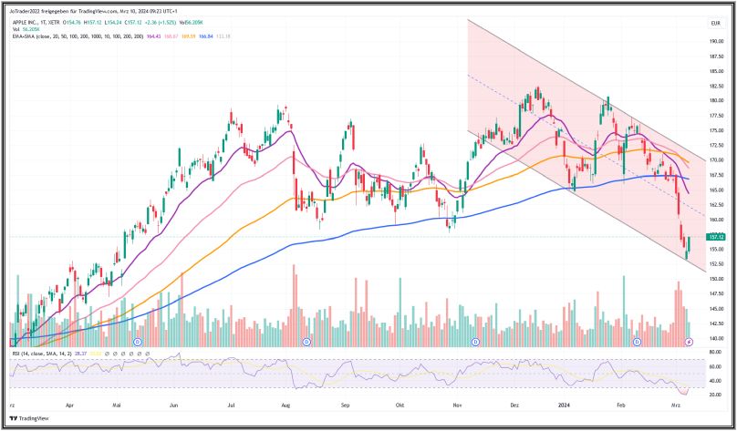 - 05.03.24: EMA50 (pink) kreuzt durch die EMA100 (100) abwärts (3.Warnsignal)