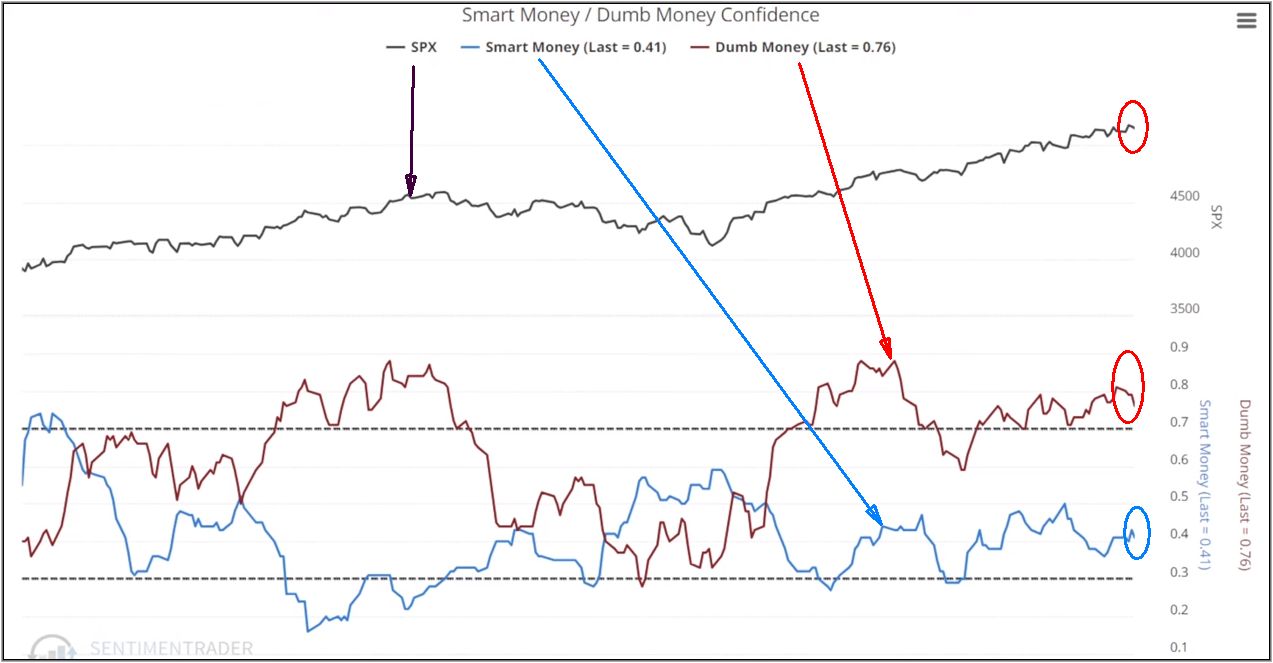 Während der S&P500 eigentlich nur moderat nachgab (roter Kreis oben) , hat das Dumb Money offensichtlich fast schon die Hosen voll und hat stark abgegeben (unterer roter Kreis). Kein Wunder wenn viele nicht nur über gehebelte Optionen schnell reich werden wollen, sondern das auch noch auf Pump tun. Dabei war ein erhöhte Vola am Freitag zu erwarten gewesen. Schaut man aber genau hin, haben die Hände der Anleger im Dumb Money Bereich, schon ab Mittwoch zu zittern begonnen, nachdem die Inflationszahlen höher ausgefallen waren, als erwartet.
