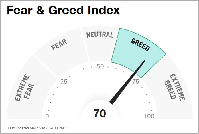 Der Fear & Greed Index liegt die 2. Woche im Bereich der „normalen“ Gier dort allerdings noch immer im oberen Bereich zur extremen Gier.
