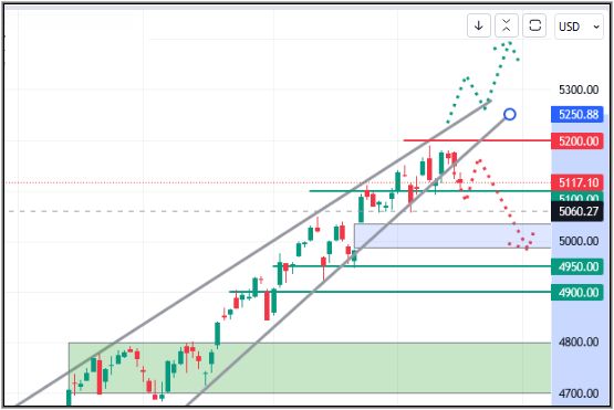Nach oben wäre bei einem Ausbruch inkl. Übertreibung, ein anstieg in den Bereich 5.300 – 5.350$ möglich, während das Ziel abwärts zuerst die 5.000$ und als momentaner Worst Case, der Bereich zwischen 4.900 – 4.950$, möglich wären. Nach dem langen Kerzendocht am Freitag, scheint der Kurs eher nach unten zu tendieren, was aber bei solchen Psycho-Börsen, nicht als so gegeben angesehen werden kann. Es sind einfach zu viele Emotionen im Spiel.