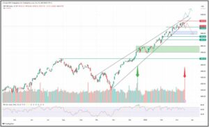 Ich hatte in der Vorwoche das negative Ausbruchsszenario im Chart belassen, allerdings etwas verschoben, nachdem der Kurs sich zuerst in Richtung oberer Keilgrenze und dort Richtung Crosspoint, zwischen oberer Keilbegrenzung und 5.200$ bewegt hat.