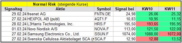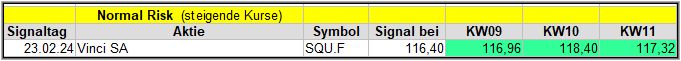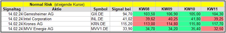 Nun kommen wir zum Update der vorigen Screener-Ergebnisse aus der KW07, KW08, KW09 und KW10, bezogen auf die Schlusskurse in KW11/24. KW06/24 fällt in dieser Woche weg.