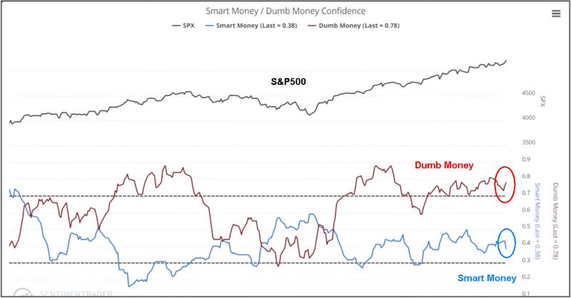 Während das Smart Money Gewinne mitnimmt (blauer Kreis), greift das Dumb Money bei Höchstpreisen (roter Kreis) zu , wie es das eigentlich immer macht in der Geschichte. ![]()