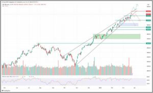 Powell hat allerdings „bald“ eine erste Zinssenkung angekündigt und gleichzeitig die Toleranz zur Inflation etwas erhöht. Wie so oft nahmen die Märkte das zuerst begeistert auf , so dass sich der Kurs wieder in die Keilformation hinein, nach oben bewegen konnte.