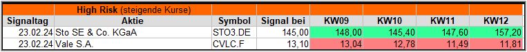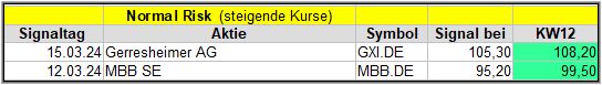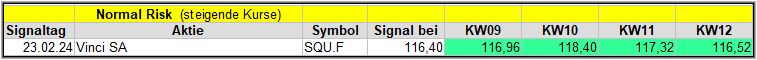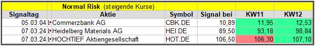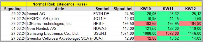 Nun kommen wir zum Update der vorigen Screener-Ergebnisse aus der KW08, KW09, KW10 und KW11, bezogen auf die Schlusskurse in KW12/24. KW07/24 fällt in dieser Woche weg.
