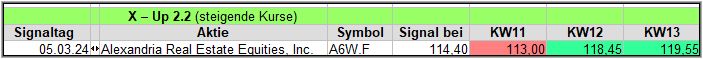 Rückblick: Hier gab es in dieser Woche nur 1 Signal. Da es sich dabei um einen Reit handelt, der immerhin eine Dividende 3,92% (April) ausschüttet, kann das dem Kurs natürlich am Ausschüttungstag etwas schaden.