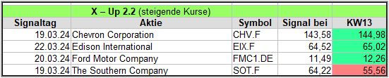 Die täglichen Signale veröffentliche ich ausschließlich in meiner Facebook-Gruppe „Aktien Chart Check“, die wöchentlichen Zusammenfassungen inkl. der Ergebnis-Updates, veröffentliche ich auch hier im Blog. Starten wir also mit den Signalen, die im Wochentakt hinzugefügt und über 4 Wochen, ein Kursupdate erhalten, um die Wirksamkeit zu prüfen.