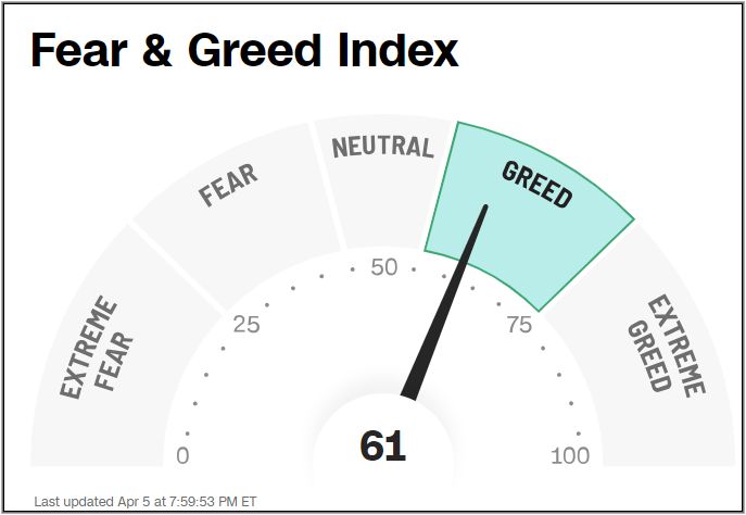 Der Fear & Greed Index liegt die 5. Woche im Bereich der „normalen“ Gier, allerdings hat er nun erstmals von > 70 auf 61 Punkte und damit in den unteren Bereich der Gier nachgegeben..