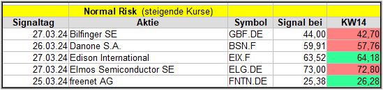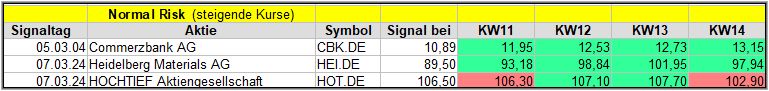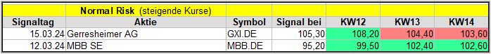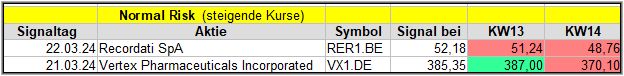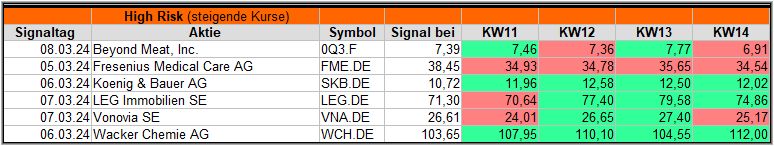 Nun kommen wir zum Update der vorigen Screener-Ergebnisse aus der KW10, KW11,KW12 und KW13, bezogen auf die Schlusskurse in KW14/24. KW09/24 fällt in dieser Woche weg.