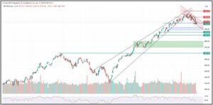 Damit hat der Index wie schon in der Vorwoche, erneut tiefere Hochs und ein tiefere Tiefs markiert, was charttechnisch bärisch ist und ich mit einem fallenden Trendkanal jetzt eingezeichnet habe.