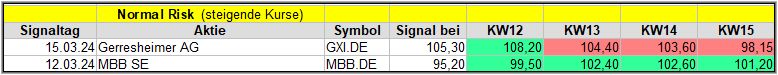 MBB hat dagegen nach einer kurzen Konsolidierung wieder zugelegt und konnte in der KW15 (siehe unten) erneut ein Kaufsignal generieren.