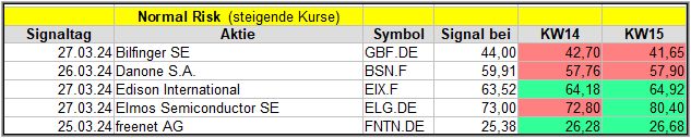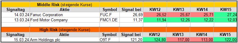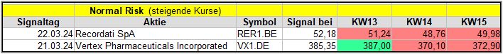 Nun kommen wir zum Update der vorigen Screener-Ergebnisse aus der KW11, KW12,KW13 und KW14, bezogen auf die Schlusskurse in KW15/24. KW10/24 fällt in dieser Woche weg.
