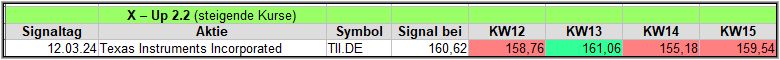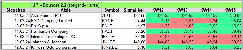 Rückblick: In dieser volatilen Woche, bedingt durch Inflations- und Wirtschaftszahlen, sowie EZB und FED Sitzungen, gab es 15 Signale. Das sind Signale, die seit einiger Zeit (seit KW08) wieder zum 1. Mal im 2 – stelligen Bereich liegen. In KW08 hatte eine „Erleichterungswelle“ die Signale ausgelöst, worauf es zu einem erneuten Rücklauf kam und es nur 4 der 12 Signale ins Plus schafften.