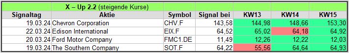 Die täglichen Signale veröffentliche ich ausschließlich in meiner Facebook-Gruppe „Aktien Chart Check“, die wöchentlichen Zusammenfassungen inkl. der Ergebnis-Updates, veröffentliche ich auch hier im Blog. Starten wir also mit den Signalen, die im Wochentakt hinzugefügt und über 4 Wochen, ein Kursupdate erhalten, um die Wirksamkeit zu prüfen.