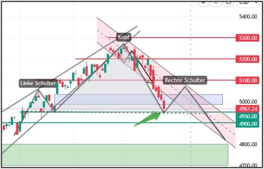 Am Freitag hab der Kurs bis auf 4953,50$ nach und hat damit die 4.950 $ getestet (grüner Pfeil) und das GAP geschlossen. Damit wäre das meiste aus diesem Zitat erledigt.