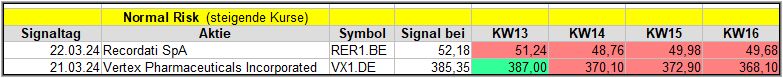 Nun kommen wir zum Update der vorigen Screener-Ergebnisse aus der KW12, KW13,KW14 und KW15, bezogen auf die Schlusskurse in KW16/24. KW11/24 fällt in dieser Woche weg.