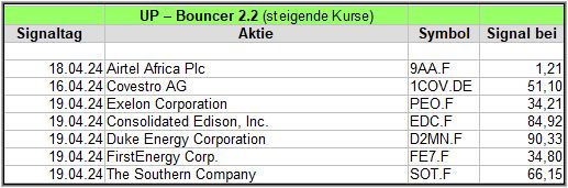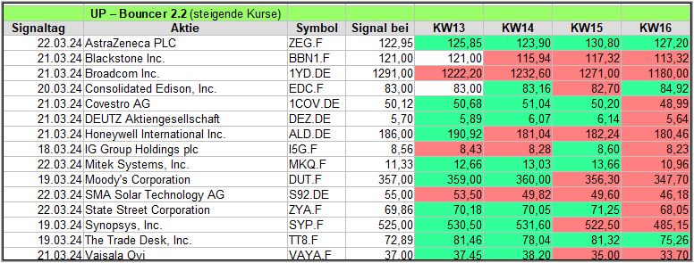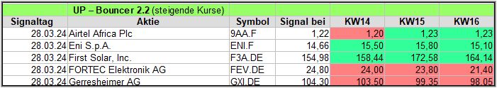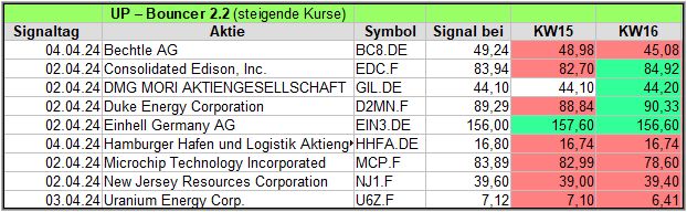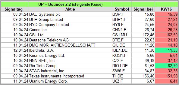 Hier eine kurze Übersicht über die Down-Bouncer Signale, die es diese Woche gab. Vorwoche in ().