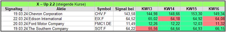 Die täglichen Signale veröffentliche ich ausschließlich in meiner Facebook-Gruppe „Aktien Chart Check“, die wöchentlichen Zusammenfassungen inkl. der Ergebnis-Updates, veröffentliche ich auch hier im Blog. Starten wir also mit den Signalen, die im Wochentakt hinzugefügt und über 4 Wochen, ein Kursupdate erhalten, um die Wirksamkeit zu prüfen.