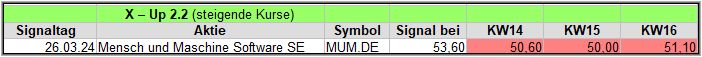 Rückblick: In dieser volatilen Woche, bedingt durch Inflations- und Wirtschaftszahlen, sowie EZB und FED Sitzungen, gab es 15 Signale. Das sind Signale, die seit einiger Zeit (seit KW08) wieder zum 1. Mal im 2 – stelligen Bereich liegen. In KW08 hatte eine „Erleichterungswelle“ die Signale ausgelöst, worauf es zu einem erneuten Rücklauf kam und es nur 4 der 12 Signale ins Plus schafften.