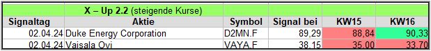 Rückblick: In der etwas schwierigen KW14, in der am Donnerstag S&P500, Nasdaq und Dow Jones etwas deutlicher abgaben, wurden überraschenderweise doch 2 Signale generiert.