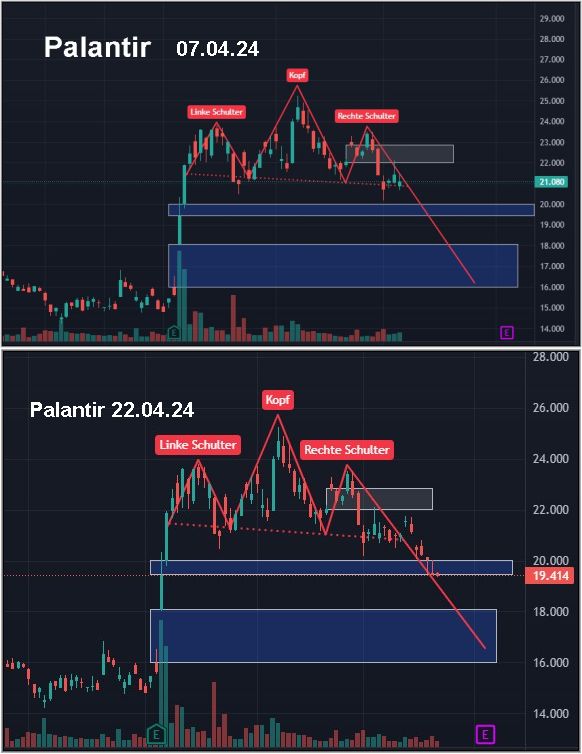 Bei Palantir , der Lieblingsaktie vieler Zocker, könnte sich eine Schulter-Kopf-Schulter (SKS) umsetzen, was deutlich fallende Kurse zur Folge haben könnte.