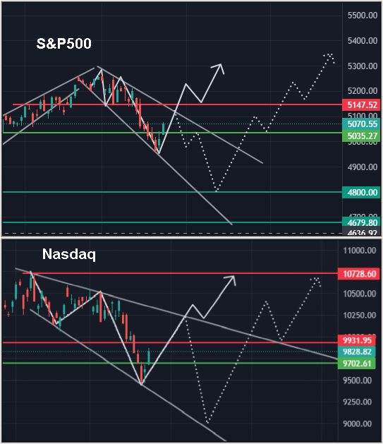 Ich habe sowohl im S&P500, als auch im Nasdaq, mögliche Verläufe eingezeichnet.