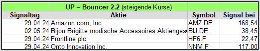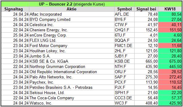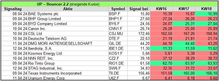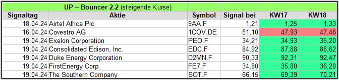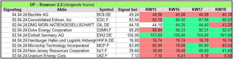 Rückblick: In dieser hochvolatilen Woche, in der es am Mittwoch und Donnerstag stärke Ausschläge abwärts gab, fand der UP-Bouncer Screener insgesamt 18 Signale.