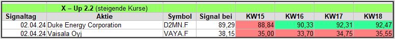 Rückblick: In der etwas schwierigen KW14, in der am Donnerstag S&P500, Nasdaq und Dow Jones etwas deutlicher abgaben, wurden überraschenderweise doch 2 Signale generiert.