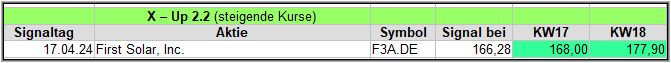 Die täglichen Signale veröffentliche ich ausschließlich in meiner Facebook-Gruppe „Aktien Chart Check“, die wöchentlichen Zusammenfassungen inkl. der Ergebnis-Updates, veröffentliche ich auch hier im Blog. Starten wir also mit den Signalen, die im Wochentakt hinzugefügt und über 4 Wochen, ein Kursupdate erhalten, um die Wirksamkeit zu prüfen.