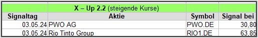 Dieser Screener setzt auf steigende Kurse , die Signale können einen schnellen, kurzen Schub inkl. Fehlausbruch, aber auch einen bevorstehenden Trend nach oben anzeigen, was das gewünschte Ziel ist. Mit der Chance steigt allerdings wie immer, auch das Risiko!