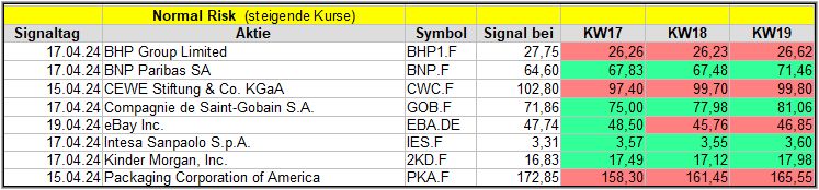 Nun kommen wir zum Update der vorigen Screener-Ergebnisse aus der KW15, KW16,KW17 und KW18, bezogen auf die Schlusskurse in KW19/24. KW14/24 fällt in dieser Woche weg.