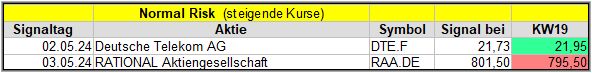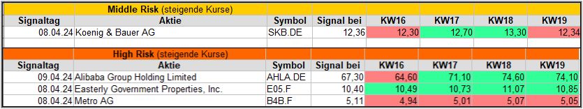 Koenig & Bauer rutsche als Middle-Risk Signal, in der letzten Woche noch ins Minus, während 2 der High-Risk Werte, im Plus liegen.