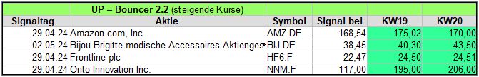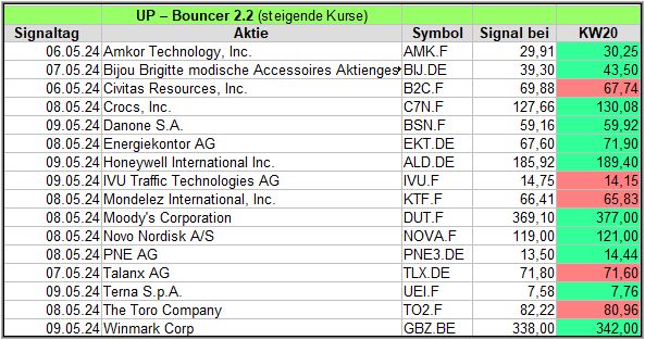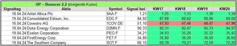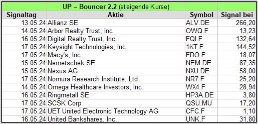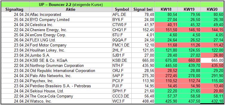 Rückblick: In dieser hochvolatilen Woche, in der es am Mittwoch und Donnerstag stärke Ausschläge abwärts gab, fand der UP-Bouncer Screener insgesamt 18 Signale.