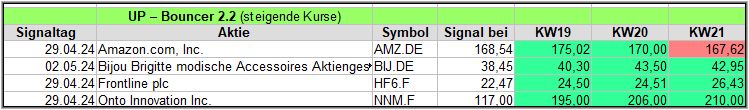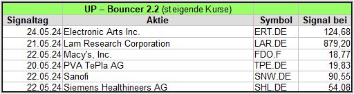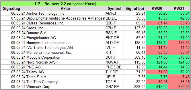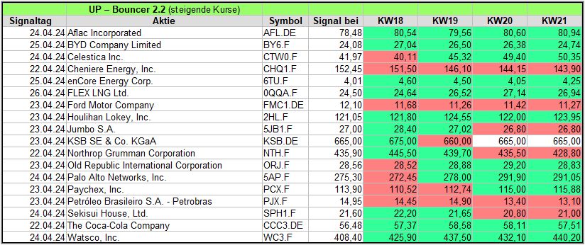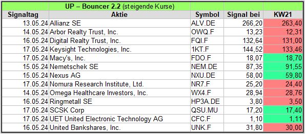 Rückblick: In dieser hochvolatilen Woche, in der es am Mittwoch und Donnerstag stärke Ausschläge abwärts gab, fand der UP-Bouncer Screener insgesamt 18 Signale.