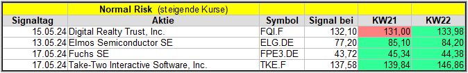 Nun kommen wir zum Update der vorigen Screener-Ergebnisse aus der KW18,KW19, KW20 und KW21, bezogen auf die Schlusskurse in KW22/24. KW17/24 fällt in dieser Woche weg.