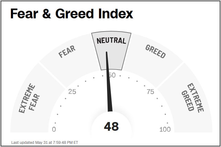 Der Fear & Greed Index liegt nach einer Woche weiter im neutralen Bereich und hat dabei vun 53 auf aktuell 48 Punkten nachgegeben.