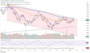 Dank der weiter fallenden Inflationszahlen in den USA, kam wieder etwas Bewegung in die Kurse, wobei sowohl der S&P500, als auch die Nasdaq an der oberen Grenze des jeweiligen, fallenden Trendkanals nach unten abgewiesen wurden. (siehe Chart)