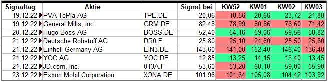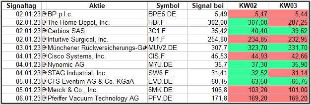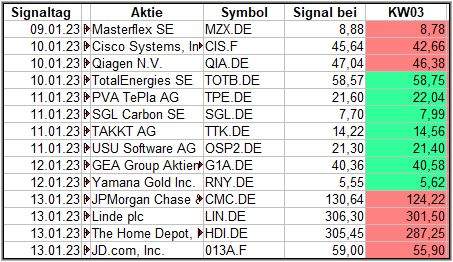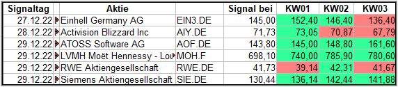 Nun kommen wir zum Update der vorigen Screener-Ergebnisse aus der KW51, KW52, KW01, KW02 bezogen auf die Schlusskurse in KW03/23. KW50/22 fällt in dieser Woche weg.