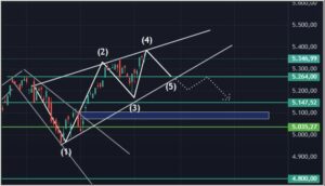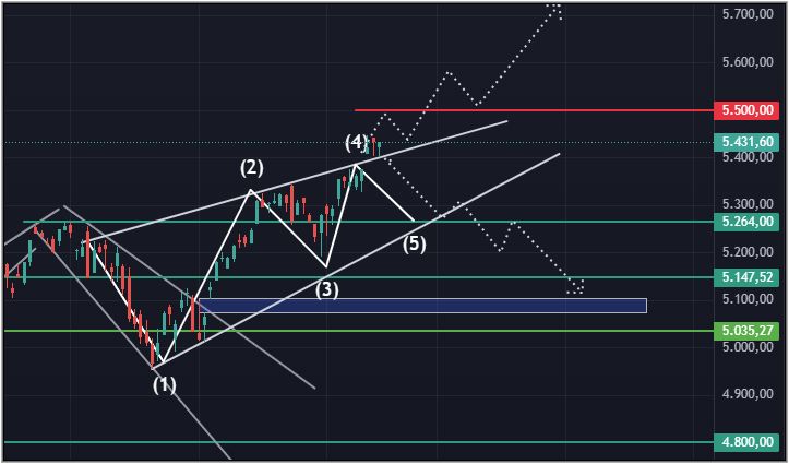 Die inverse S-K-S, wurde ausgelöst und der Kurs erreichte den o.g. Zielbereich mit 5.447$, fast genau mittig. Das hat also wunderbar gepasst.![]()