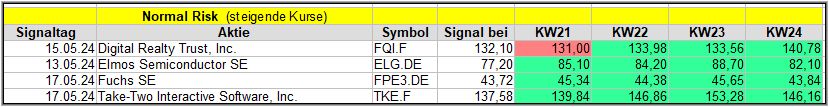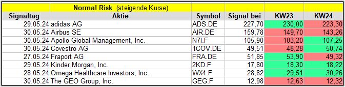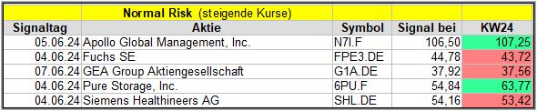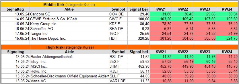 Nun kommen wir zum Update der vorigen Screener-Ergebnisse aus der KW20, KW21, KW22 und KW23, bezogen auf die Schlusskurse in KW24/24. KW19/24 fällt in dieser Woche weg.