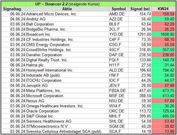 Hier eine kurze Übersicht über die Down-Bouncer Signale, die es diese Woche gab. Vorwoche in ().