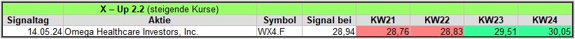 Wie schon in der KW20, wurde hier erneut ein Signal für Omega Health generiert und nach der 1. Woche liegt der Wert im Plus.