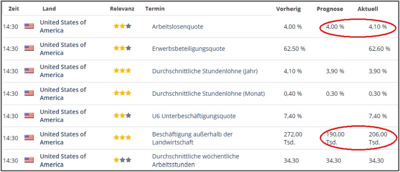 Feiertag am Donnerstag in den USA und am Freitag die NFP Daten , sorgten im Vorfeld für Bewegung. Die Arbeitslosigkeit ist leicht angestiegen und die Beschäftigung NFP außerhalb der Landwirtschaft ist mit 206k deutlich über den Prognosen von 190k. Das ist schlecht für die Börsen, denn so sieht sich die FED nicht zu Zinssenkungen genötigt.