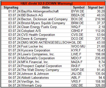 Aus diesem Grund veröffentliche ich jetzt nur noch die H&R Down Signale, die aber einen guten Überblick zur Gesamtlage geben. Die einzelnen Down-Signale werden täglich in der Facebook Gruppe Aktien Chart Check veröffentlicht.