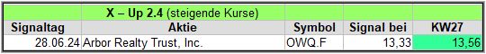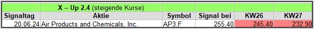 Die täglichen Signale veröffentliche ich in meiner Facebook-Gruppe „Aktien Chart Check“, die wöchentlichen Zusammenfassungen inkl. der Ergebnis-Updates, veröffentliche ich auch hier im Blog. Starten wir also mit den Signalen, die im Wochentakt hinzugefügt und über 4 Wochen, ein Kursupdate erhalten, um die Wirksamkeit zu prüfen.