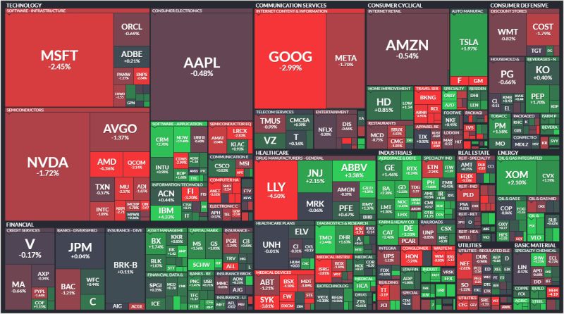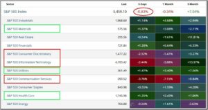 Nachfolgend die Sektorenübersicht innerhalb des S&P500, die sich auf den ersten Blick deutlich nach Farbe rot, im Bereich der Tech-Werte verändert hat. Dafür wurden mehr Werte aus den anderen Sektoren nach Grün verschoben.
