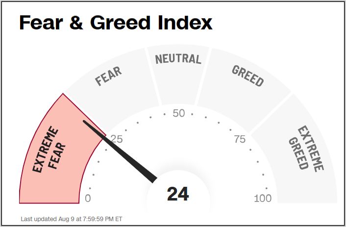 Der Fear & Greed Index hatte bereits in der Vorwochen den Bereich der Angst betreten und hat in diese Woche von 27 auf aktuell 24Punkte nachgegeben.